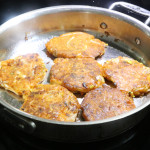 Generously coat a medium-high heat pan with cooking oil (about 2 Tbsp), then scoop a spoonful of batter into the pan and spread it into a round shape, about 2 inches in diameter.