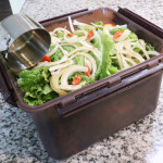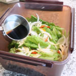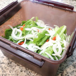 Place a portion of lettuce in a fridge‑safe container. Tip: When placing the lettuce on it, press down gently. Then, sprinkle one portion of the sliced onion and red chili evenly on top of the lettuce portion.
