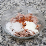 Add 2 Tbsp chopped onion, 2 Tbsp mayonnaise, 2 tsp sriracha, and ½ tsp sugar to the tuna. Mix everything until smooth.