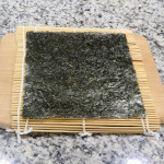 Place a bamboo mat for kimbap on a cutting board. Put 1 sheet of dried laver on the mat with the rough side facing up.