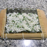 Take one portion of the seasoned rice and spread it evenly over about ¾ of the seaweed sheet. Place a few grains of rice along the top edge of the seaweed to help seal the roll later.