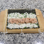 Take one portion of the tuna mixture and place it in a line across the center of the rice.
