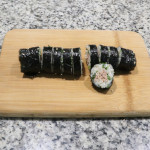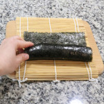 Using the bamboo mat, carefully roll the seaweed over the filling. Gently press and squeeze the roll with the mat to help it hold its shape. Repeat with the remaining ingredients.